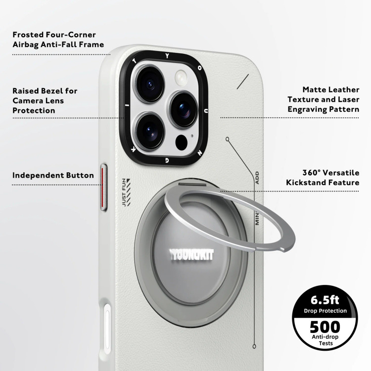 قاب یانگکیت Leather 360 Rotation Ring Stand Magsafe در محل دکمه های کناری دارای برجستگی هایی است که در هنگام استفاده از آنها راحت تر باشید. محل پورت ها و دوربین در این قاب به خوبی برش خورده است تا در مواقع نیاز به آسانی به آنها دسترسی داشته باشید.*